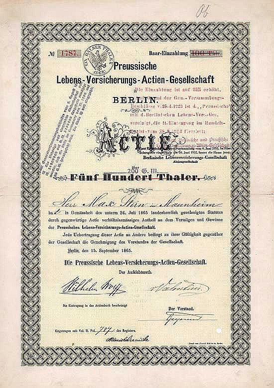 Fondata nel 1865. Area di affari: Germania e Stati Uniti del Nord America (a causa dell'elevato numero di emigranti tedeschi). Quotazione in borsa a Berlino, con dividendi fino al 20% una società con ottimi guadagni. Nel 1923 fusione con la Berlinische Lebensversicherung. Una società che esiste ancora oggi ed è assegnata alla sfera di interessi della Deutsche Bank.