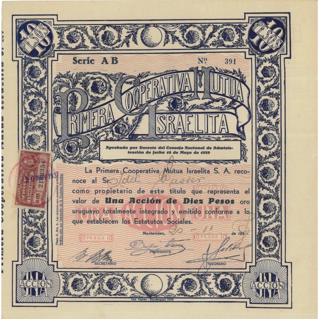 A-62766Primera cooperativa mutua israelita-1 Montevideo19371 ShareR2 (1001-5000 pezzi)S2 (da 26 a 50 €)