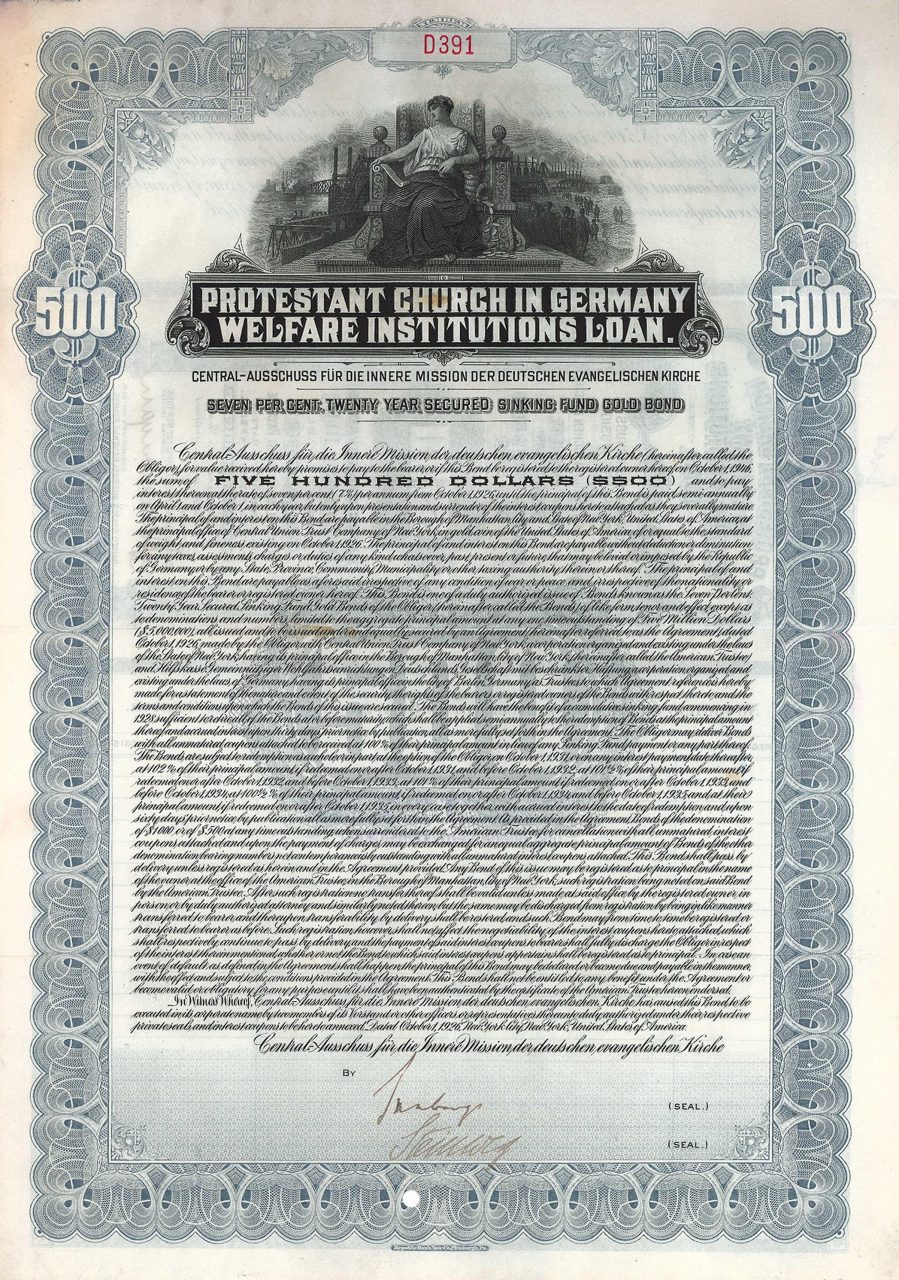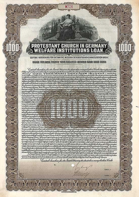 17 Protestant Church in Germany Welfare Institutions Loan 7% Twenty Year Secured Sinking Fund Gold Bonds 1926