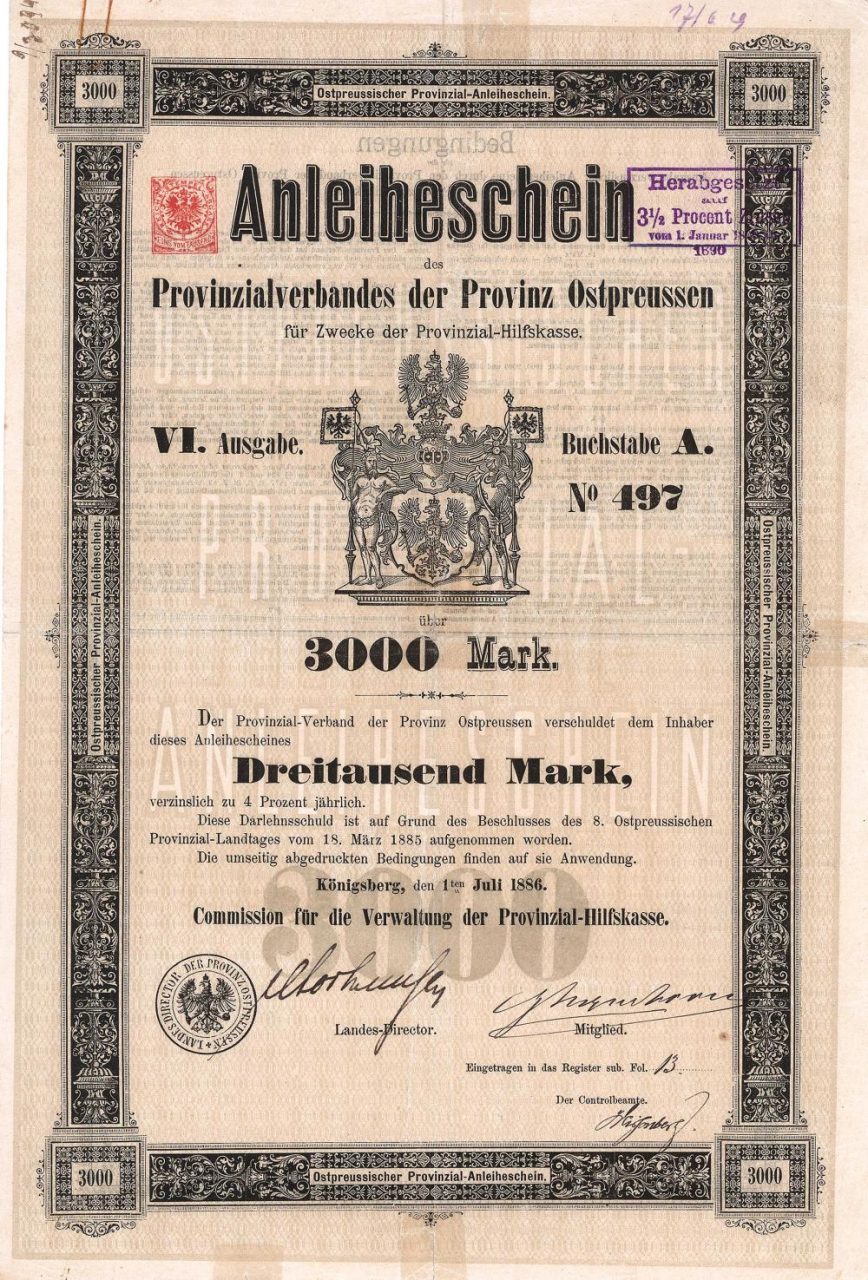 Il Fondo provinciale per gli aiuti nasce come istituto bancario pubblico nel 1853 ed era amministrato da una commissione speciale dell’Associazione provinciale. Non furono rifinanziati direttamente, ma indirettamente tramite obbligazioni (concesse 6 milioni di M nel 1878 e poi 20 milioni di M nel 1885), che l’Associazione provinciale raccolse. Nel 1919 viene ribattezzato “Landesbank der Provinz Ostpreußen”.