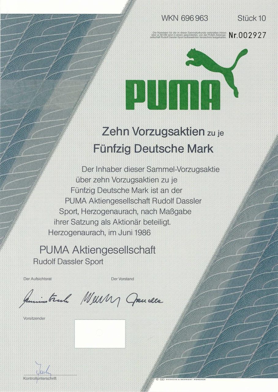 Nel 1924, Adolf (Adi) e Rudolf Dassler fondarono la fabbrica di scarpe sportive Gebrüder Dassler a Herzogenaurach, in Franconia. Dopo disaccordi, i loro percorsi si separarono: Adolf Dassler continuò a gestire la compagnia da solo come “Adidas”, Rudolf Dassler fondò la propria compagnia con “Puma”. Morì nel 1974 e i suoi figli Armin e Gerd assunsero la direzione dell’azienda, anche se senza fortuna. Dopo essersi convertito in una società per azioni, è diventato pubblico nel 1986, sebbene Puma abbia continuato a registrare perdite per anni. La crisi del 1993 è stata seguita da un riorientamento del marchio sotto Jochen Zeitz: Puma è stato il primo marchio sportivo a concentrarsi su prodotti di moda e lifestyle oltre alla gamma sportiva. Nel 1994 il primo profitto fu registrato dopo l’IPO, nel 1996 Puma divenne uno dei pesi massimi della MDAX. Dall’estate 2007, PUMA è stata la maggioranza del gruppo francese di beni di lusso PPR (Pinault-Ptrintemps-Redoute, il terzo gruppo al mondo per lusso e vendita al dettaglio) (tra l’altro dopo il 27% del patto degli eredi di Tchibo Geschwister Herz). Il prodotto originale “scarpe” rappresenta ancora quasi il 50% delle vendite del gruppo di 3,3 miliardi di euro, oltre a tessuti (36%) e accessori (17%). Le licenze vengono assegnate a partner indipendenti per profumi, occhiali, orologi e, più recentemente, telefoni cellulari.