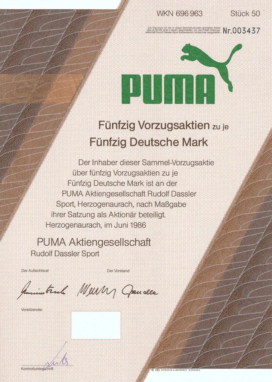 Nel 1924, Adolf (Adi) e Rudolf Dassler fondarono la fabbrica di scarpe sportive Gebrüder Dassler a Herzogenaurach, in Franconia. Dopo disaccordi, i loro percorsi si separarono: Adolf Dassler continuò a gestire la compagnia da solo come “Adidas”, Rudolf Dassler fondò la propria compagnia con “Puma”. Morì nel 1974 e i suoi figli Armin e Gerd assunsero la direzione dell’azienda, anche se senza fortuna. Dopo essersi convertito in una società per azioni, è diventato pubblico nel 1986, sebbene Puma abbia continuato a registrare perdite per anni. La crisi del 1993 è stata seguita da un riorientamento del marchio sotto Jochen Zeitz: Puma è stato il primo marchio sportivo a concentrarsi su prodotti di moda e lifestyle oltre alla gamma sportiva. Nel 1994 il primo profitto fu registrato dopo l’IPO, nel 1996 Puma divenne uno dei pesi massimi della MDAX. Dall’estate 2007, PUMA è stata la maggioranza del gruppo francese di beni di lusso PPR (Pinault-Ptrintemps-Redoute, il terzo gruppo al mondo per lusso e vendita al dettaglio) (tra l’altro dopo il 27% del patto degli eredi di Tchibo Geschwister Herz). Il prodotto originale “scarpe” rappresenta ancora quasi il 50% delle vendite del gruppo di 3,3 miliardi di euro, oltre a tessuti (36%) e accessori (17%). Le licenze vengono assegnate a partner indipendenti per profumi, occhiali, orologi e, più recentemente, telefoni cellulari.