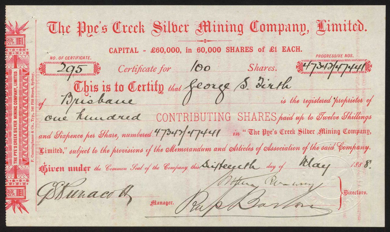 A-32828Pye’s Creek Silver Mining Company Limited-1Nuovo Galles del Sud1888£1 Shares- RedR2 (1001-5000 pezzi)S2 (da 26 a 50 €)