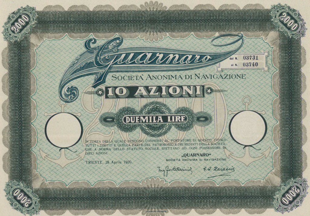 B-4204Quarnaro S.A. di Navigazione-2Modiano - TriesteTrieste192010 azioni di fondazione al portatore da Lire 200R3 (501-1000 pezzi)S3 (da 51 a 100 €)