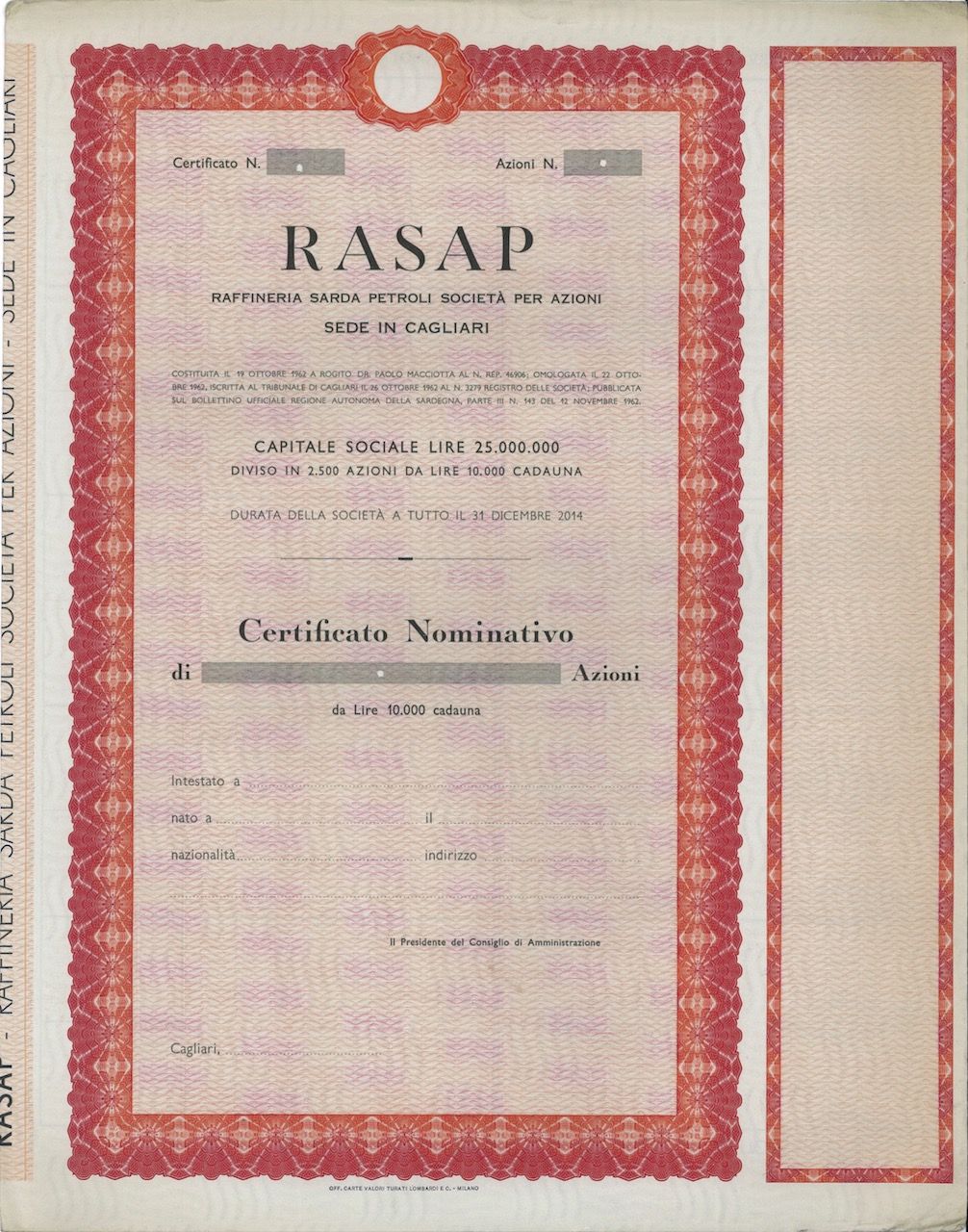 A-12529Rasap – Raffineria Sarda Petroli S.p.A.-1Officina Carte Valori Turati Lombardi e C. - MilanoCagliari1962VariabileR2 (1001-5000 pezzi)S1 (da 0 a 25 €)