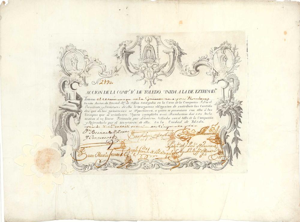 Fondata nel 1748 con lo scopo di coltivare piantagioni di gelso, allevare bachi da seta e produrre seta. Soprattutto, dovevano essere rimessi in forma i produttori di seta e tessuti malandati a Toledo e nei dintorni. Oltre al commercio di tessuti di seta, l’azienda commerciava anche di armi, lana, ecc. La rivoluzione francese ebbe effetti catastrofici sul commercio della seta della società: condannati come articoli di lusso dai rivoluzionari, non c’erano quasi acquirenti per i tessuti di seta. Alla fine questo ha portato al fallimento dell’azienda.