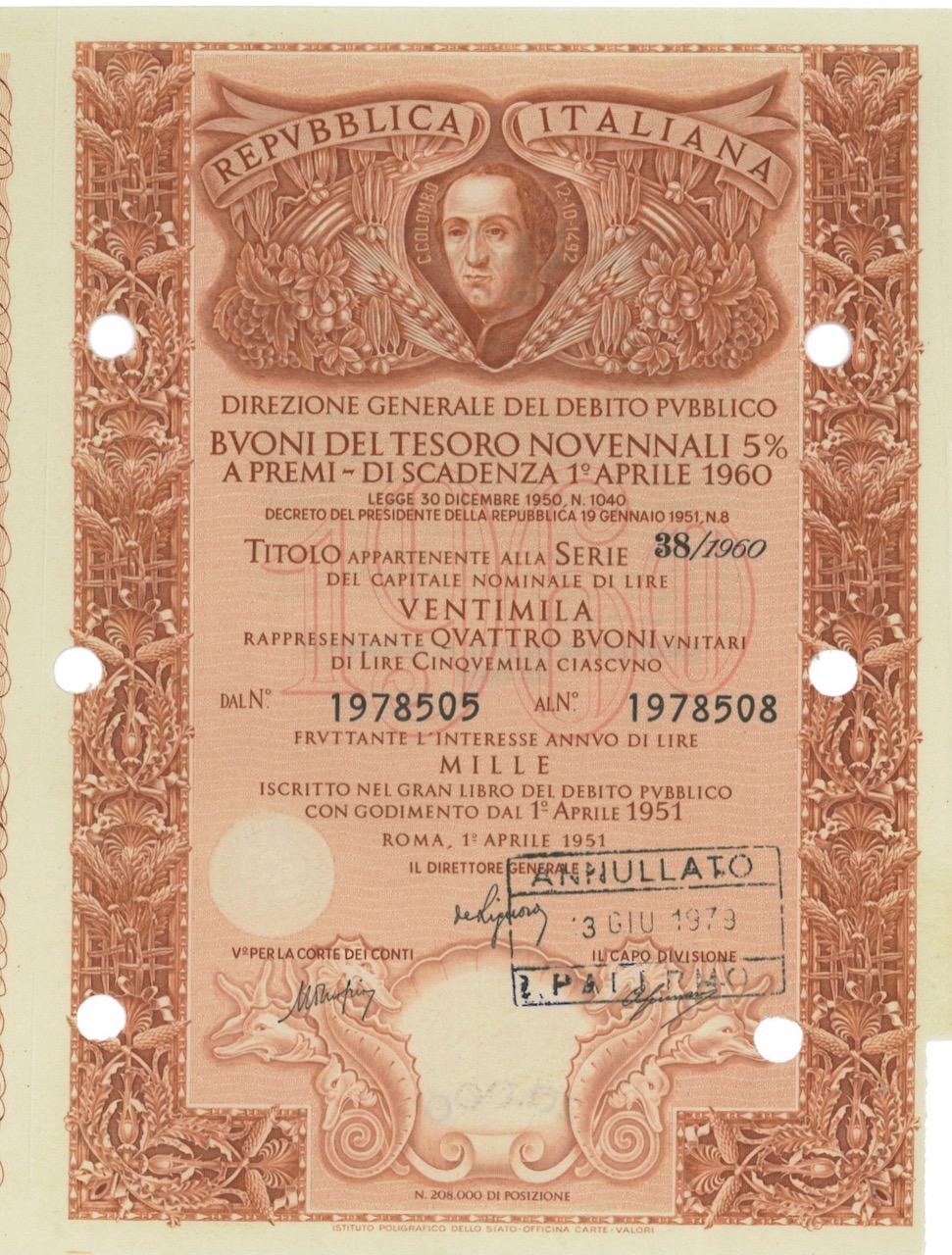C-16077Repubbl. Ital. – Buono del Tesoro Novenn. 5% a Premi – di Scad. 1° Aprile 1960-3Roma19514 buoni-20000 lireArancioneR4 (251-500 pezzi)S3 (da 51 a 100 €)