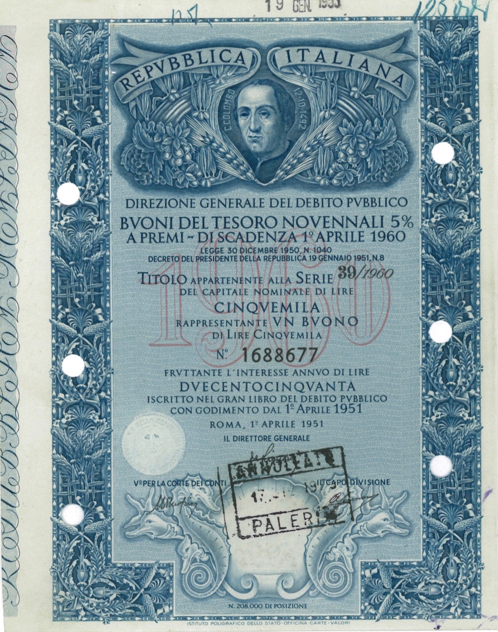 Repubbl. Ital. – Buono del Tesoro Novenn. 5% a Premi – di Scad. 1° Aprile 1960