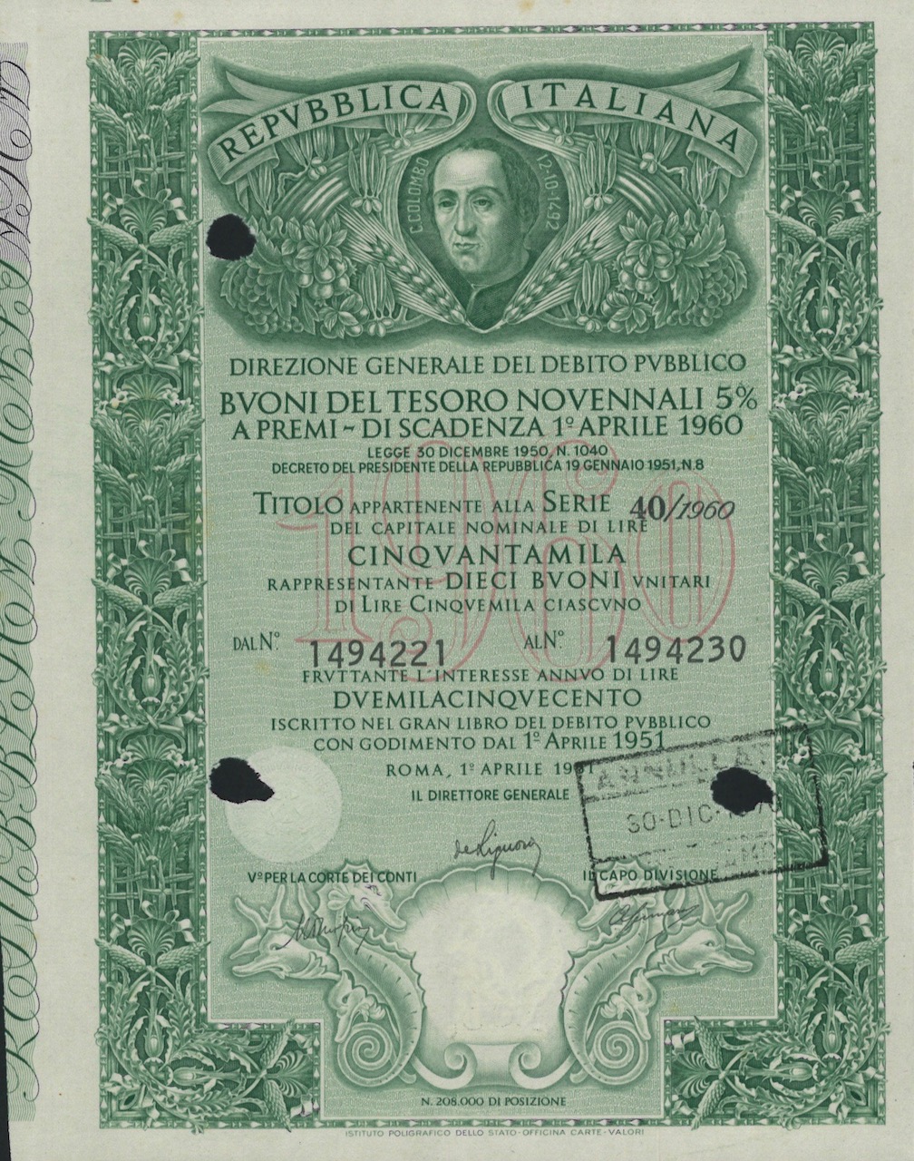 D-16077Repubbl. Ital. – Buono del Tesoro Novenn. 5% a Premi – di Scad. 1° Aprile 1960-4Roma195110 buoni-50000 lireVerdeR4 (251-500 pezzi)S4 (da 101 a 250 €)