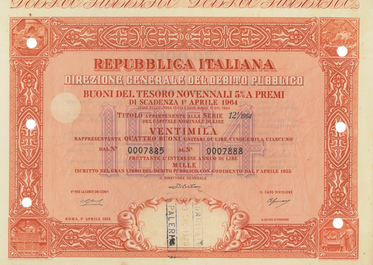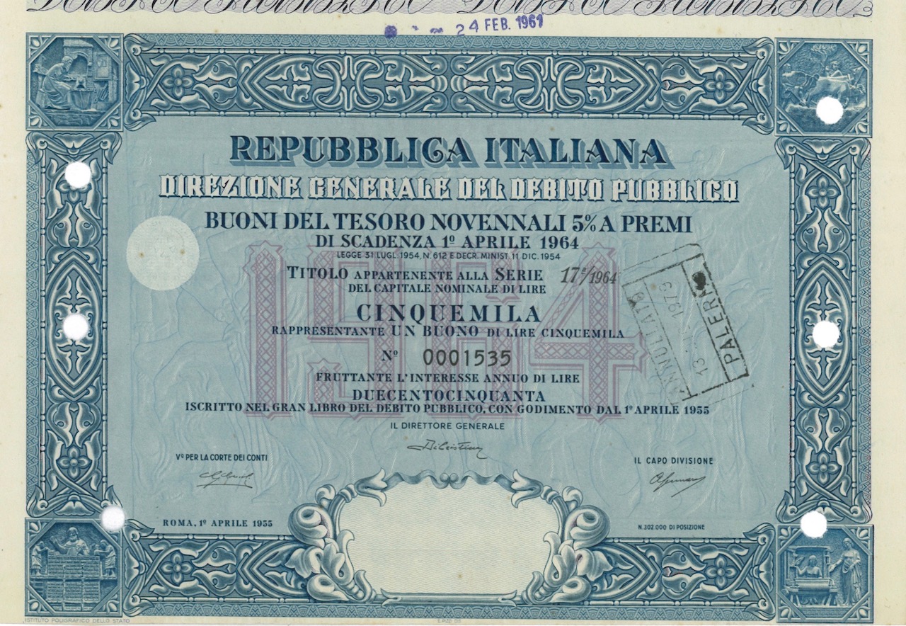 Repubbl. Ital. – Buono del Tesoro Novenn. 5% a Premi – di Scad. 1° Aprile 1964