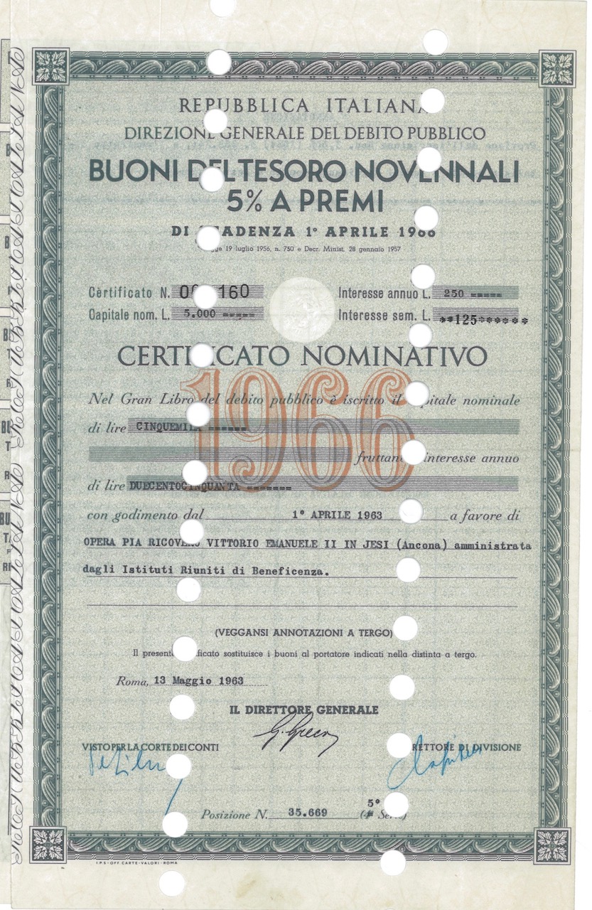 Repubbl. Ital. – BTP Nov. 5% a Premi – di Scad. 1° Aprile 1966 Cert. Nomin.