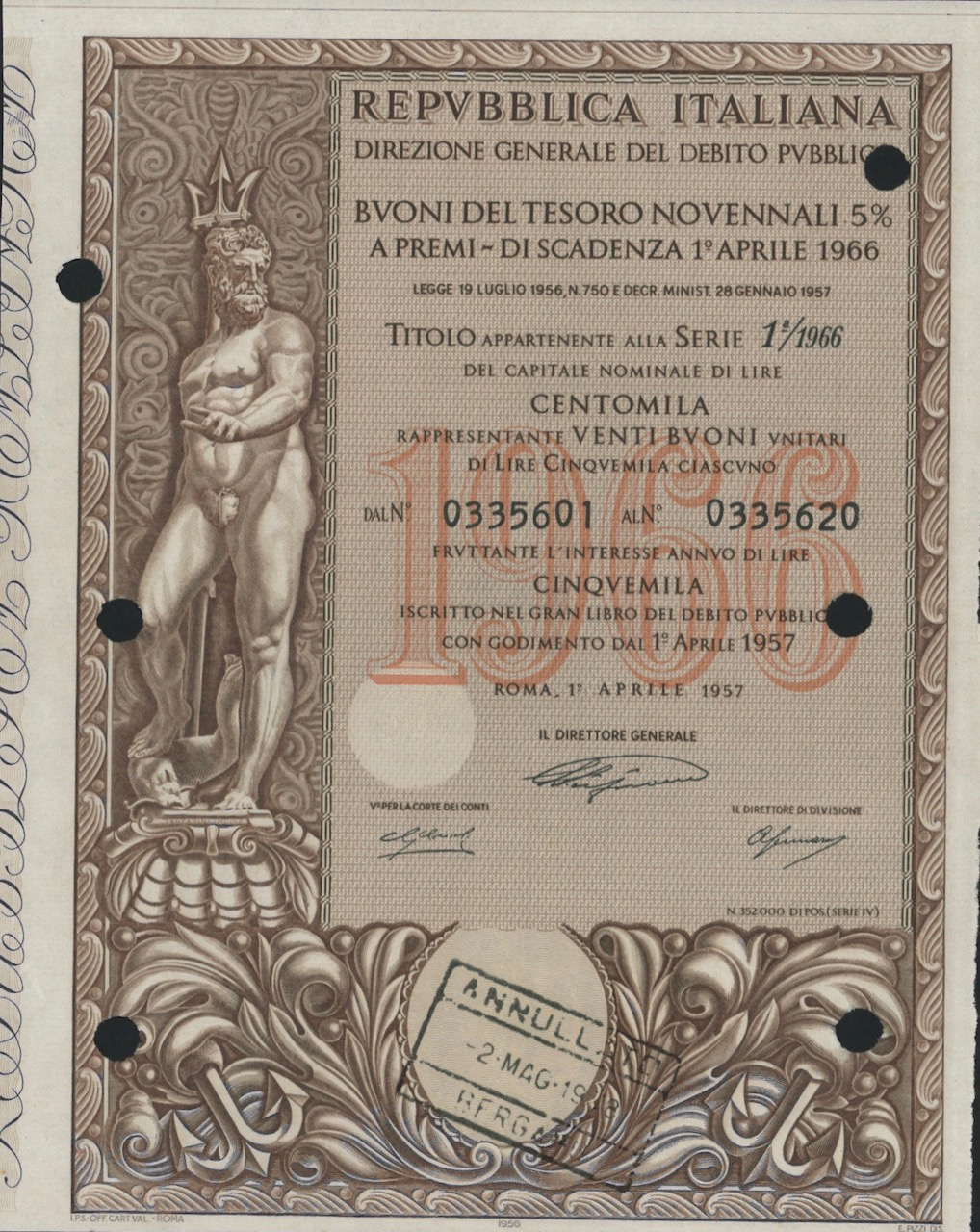 E-16115Repubbl. Ital. – BTP Nov. 5% a Premi – di Scad. 1° Aprile 1966 al Port.-5Roma1957100000 lireMarroneR4 (251-500 pezzi)S4 (da 101 a 250 €)