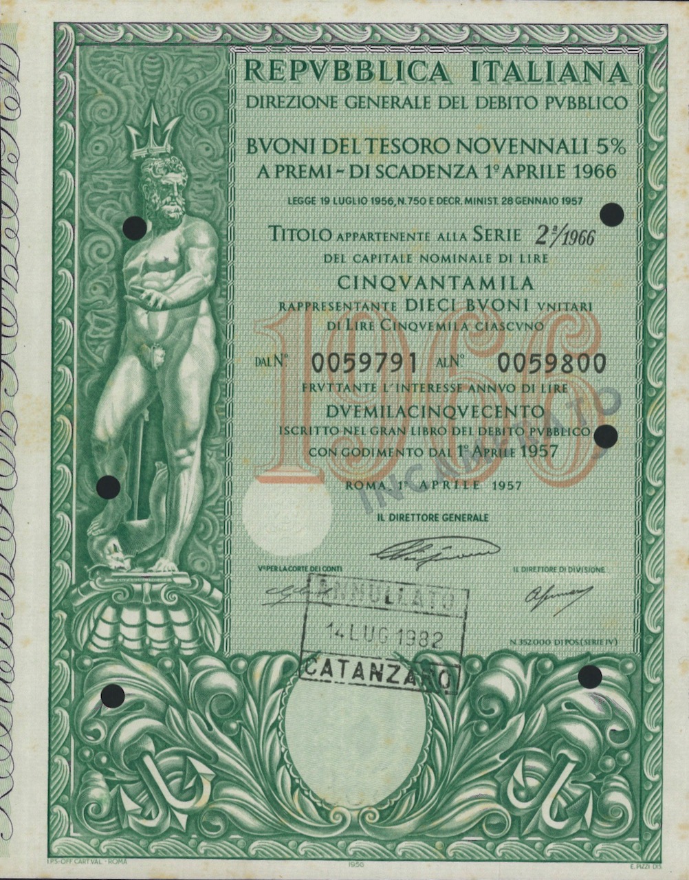 D-16115Repubbl. Ital. – BTP Nov. 5% a Premi – di Scad. 1° Aprile 1966 al Port.-4Roma195750000 lireVerdeR3 (501-1000 pezzi)S3 (da 51 a 100 €)