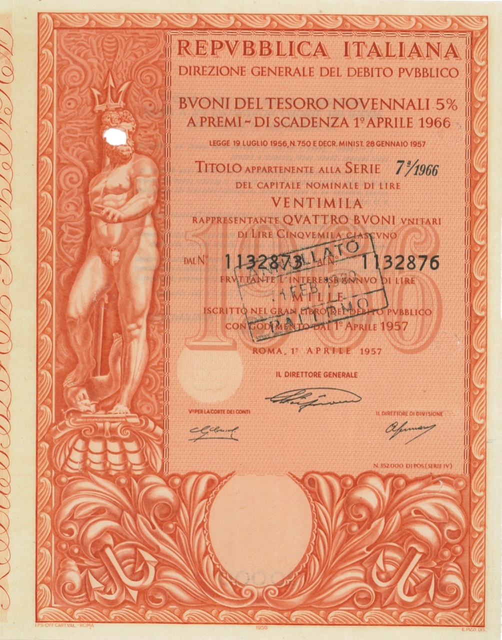 C-16115Repubbl. Ital. – BTP Nov. 5% a Premi – di Scad. 1° Aprile 1966 al Port.-3Roma195720000 lireArancioneR3 (501-1000 pezzi)S3 (da 51 a 100 €)
