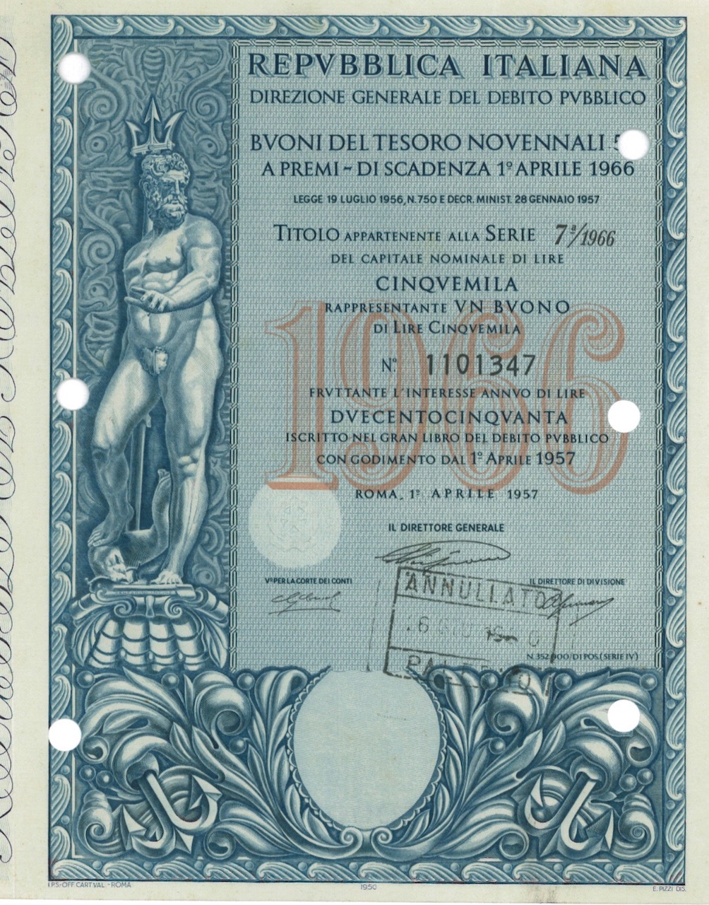 A-16115Repubbl. Ital. – BTP Nov. 5% a Premi – di Scad. 1° Aprile 1966 al Port.-1Roma19575000 lireAzzurroR3 (501-1000 pezzi)S3 (da 51 a 100 €)
