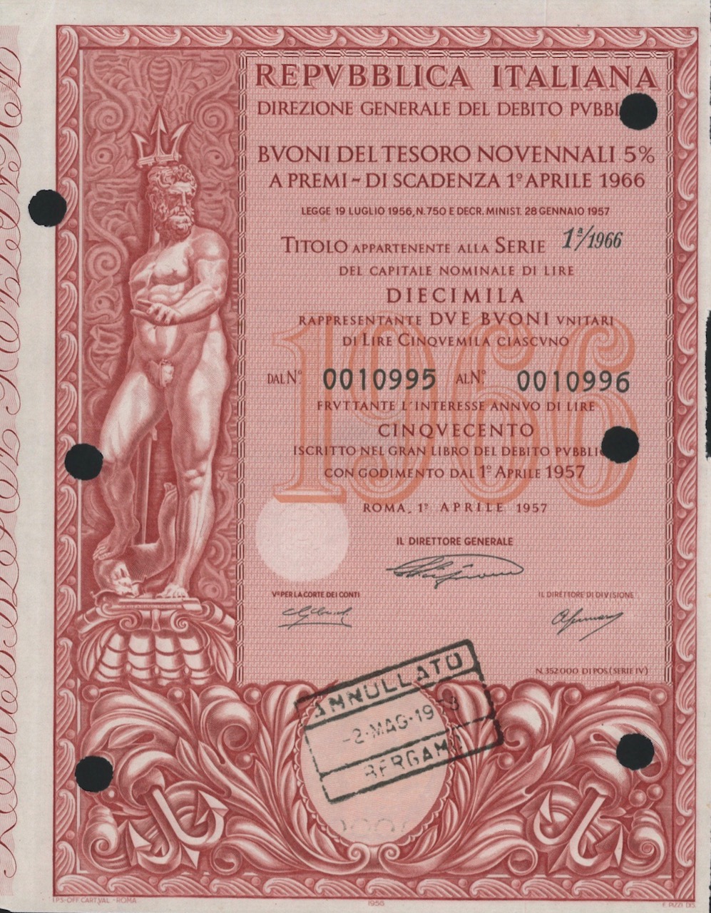 B-16115Repubbl. Ital. – BTP Nov. 5% a Premi – di Scad. 1° Aprile 1966 al Port.-2Roma195710000 lireRossoR3 (501-1000 pezzi)S3 (da 51 a 100 €)