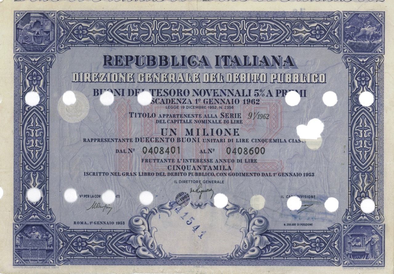 Repubbl. Ital. – Buono del Tesoro Novenn. 5% a Premi – di Scad. 1° Gennaio 1962