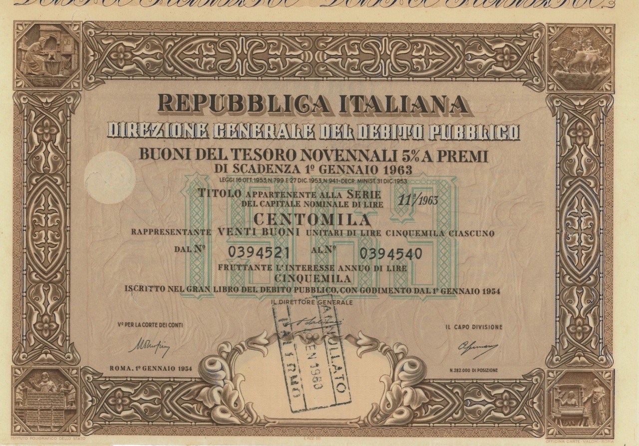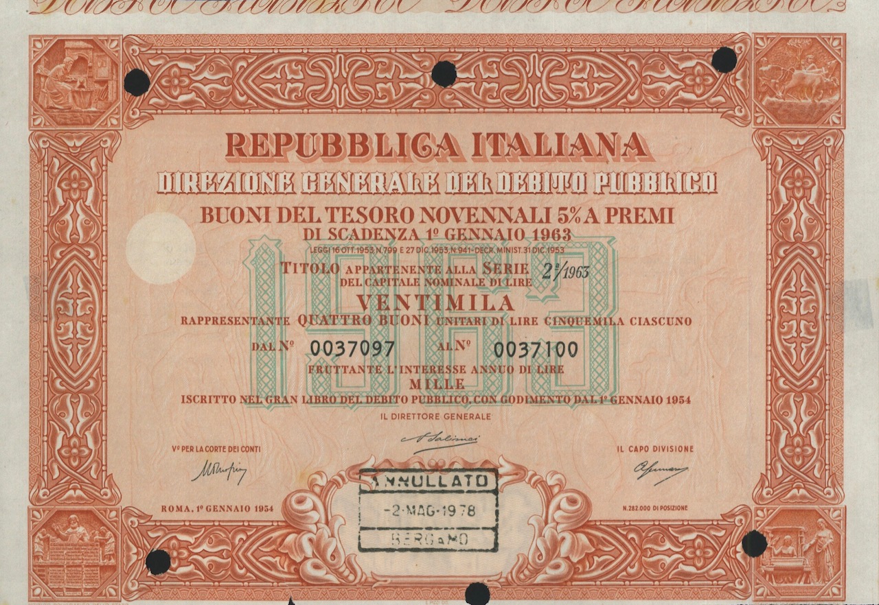 Repubbl. Ital. – Buono del Tesoro Novenn. 5% a Premi – di Scad. 1° Gennaio 1963