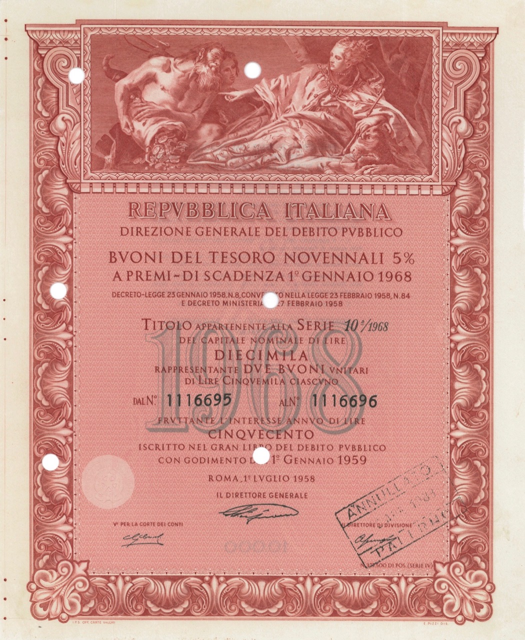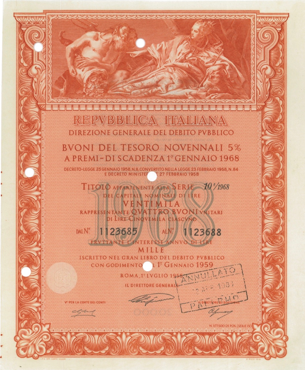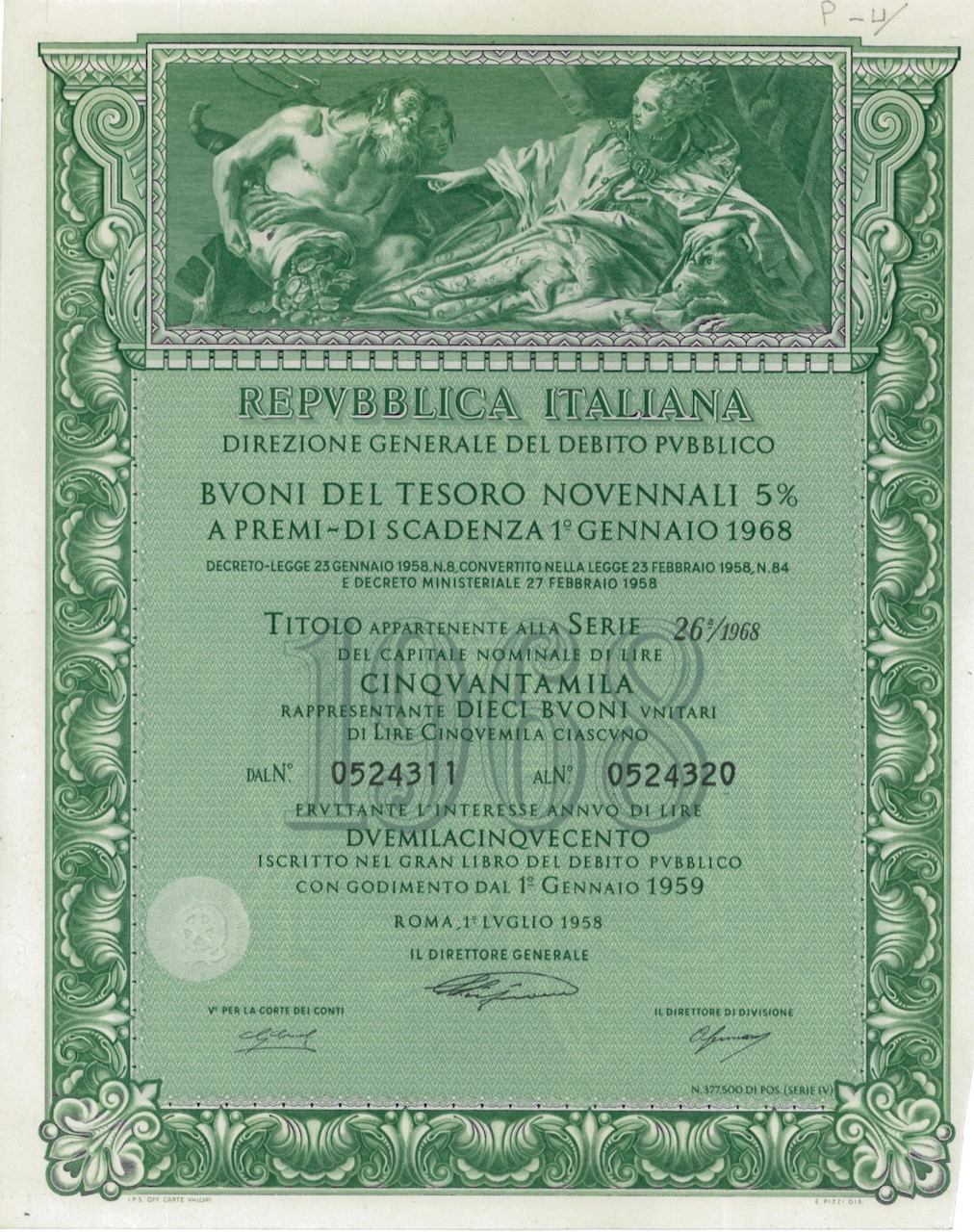 Repubbl. Ital. – BTP Nov. 5% a Premi – di Scad. 1° Gennaio 1968 al Port.