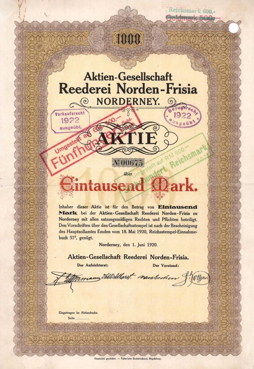 Nel 1871 fondazione della compagnia di navigazione a vapore “Norden” come compagnia di navigazione partner, nel 1872 apertura del traffico estivo sulla linea Norddeich-Norderney, dal 1888 anche un collegamento programmato tra Norddeich-Juist. Anche gli hotel “Fährhaus” e “Norddeich” a Norddeich appartenevano alla compagnia di navigazione. Nel 1898 costruzione di una ferrovia trainata da cavalli tra il molo Juister e l’Inselbahnhof, nel 1899 la ferrovia viene motorizzata. Nel 1906 un concorrente apparve sulla linea Norddeich-Norderney con la compagnia di navigazione a vapore “Frisia”, nel 1917 entrambe le linee si fusero per formare la “AG Reederei Norden-Frisia” dopo che la compagnia di navigazione “Norden” fu trasformata in una AG nel 1910. Nel 1920 fusione con la compagnia di spedizioni AG “Juist”, che fu scacciata dalla compagnia di spedizioni “Norden” nel 1908. Nel 1931 mette in servizio il primo grande garage a Norddeich. Nel 1969 fondazione della FRISIA Luftverkehr GmbH per voli tra la terraferma e le isole del Mare del Nord.