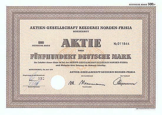 Nel 1871 fondazione della compagnia di navigazione a vapore “Norden” come compagnia di navigazione partner, nel 1872 apertura del traffico estivo sulla linea Norddeich-Norderney, dal 1888 anche un collegamento programmato tra Norddeich-Juist. Anche gli hotel “Fährhaus” e “Norddeich” a Norddeich appartenevano alla compagnia di navigazione. Nel 1898 costruzione di una ferrovia trainata da cavalli tra il molo Juister e l’Inselbahnhof, nel 1899 la ferrovia viene motorizzata. Nel 1906 un concorrente apparve sulla linea Norddeich-Norderney con la compagnia di navigazione a vapore “Frisia”, nel 1917 entrambe le linee si fusero per formare la “AG Reederei Norden-Frisia” dopo che la compagnia di navigazione “Norden” fu trasformata in una AG nel 1910. Nel 1920 fusione con la compagnia di spedizioni AG “Juist”, che fu scacciata dalla compagnia di spedizioni “Norden” nel 1908. Nel 1931 mette in servizio il primo grande garage a Norddeich. Nel 1969 fondazione della FRISIA Luftverkehr GmbH per voli tra la terraferma e le isole del Mare del Nord.