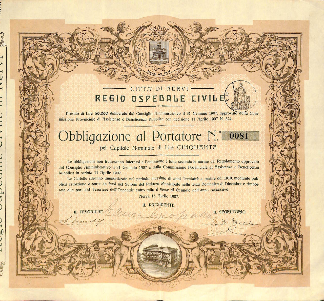 La prima pietra del nosocomio fu posta il 24 febbraio 1907, epoca in cui era sindaco di Nervi Edoardo Basso.