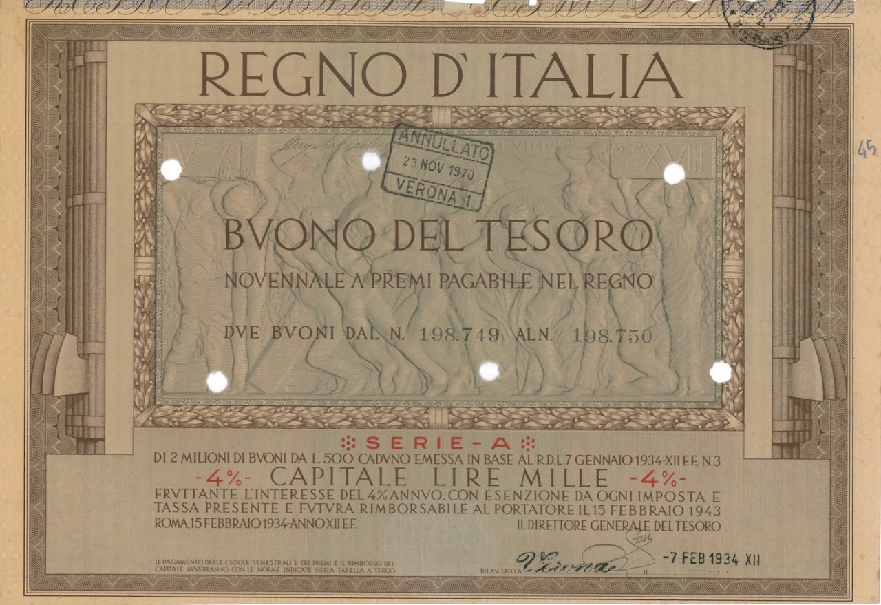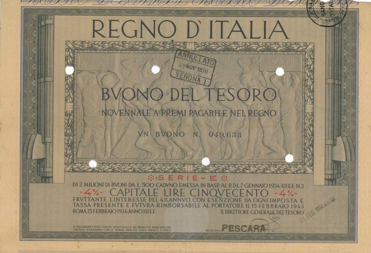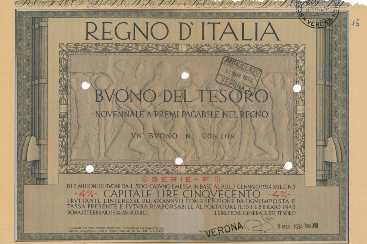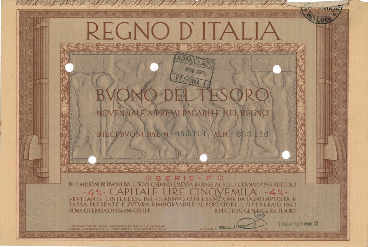 Regno d’Italia – Buono del Tesoro Nov. a Premi Pagabile nel Regno (7/01/1934)