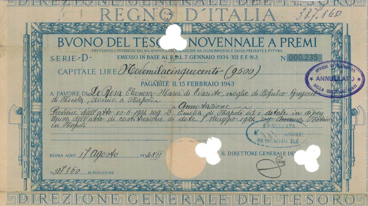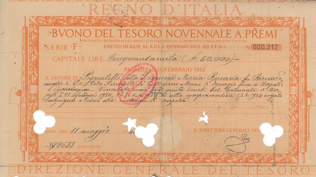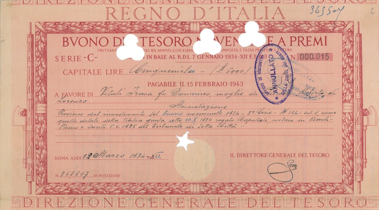 Regno d’Italia – Buono del Tesoro Novennale a Premi (7/01/1934)