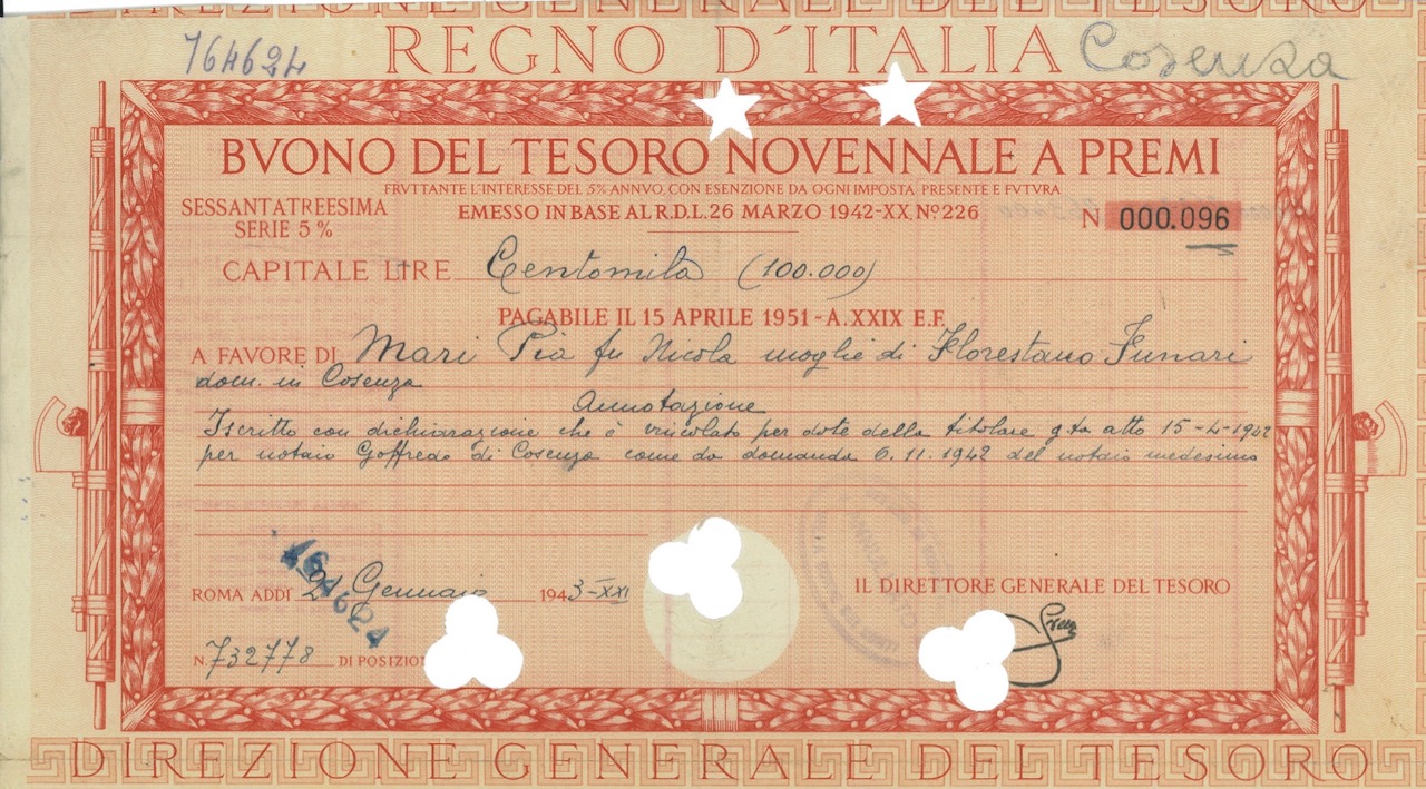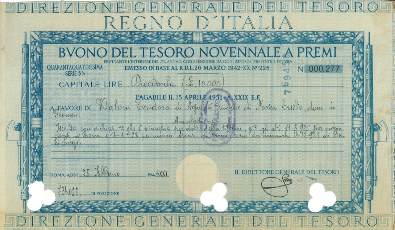 Regno d’Italia – Buono del Tesoro Novennale a Premi (26/03/1942)
