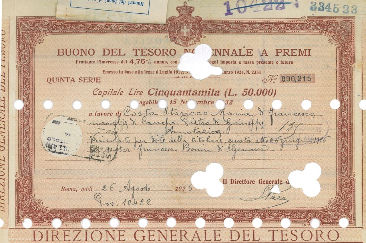 A-15609Regno d’Italia – Buono del Tesoro Novennale a Premi (4,75%)-1Roma192650000 lireMarrone, rosaR3 (501-1000 pezzi)S4 (da 101 a 250 €)
