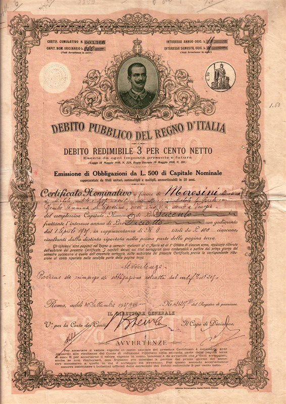 Regno d’Italia – Debito Redimibile 3 per cento netto