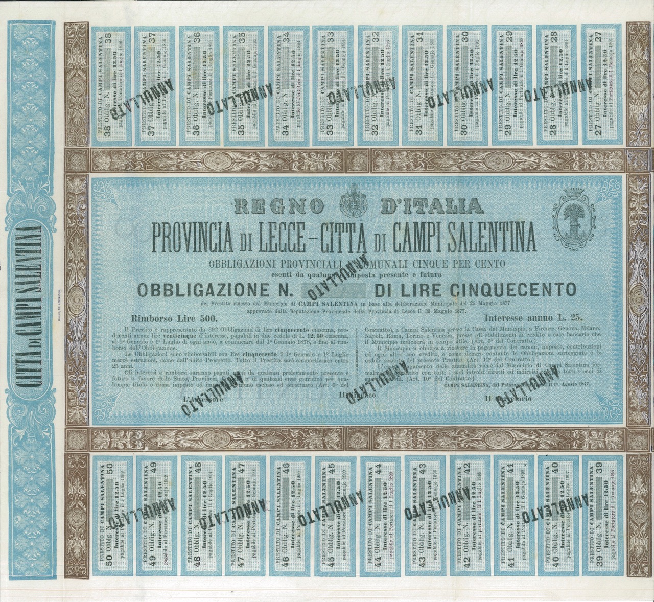 A-9907Regno d’Italia – Prov. di Lecce – Città di Campi Salentina-1Tip. Bernardoni di C. Rebeschini & C.Lecce18771 obbligazioneR6 (51-100 pezzi)S5 (da 251 a 500 €)
