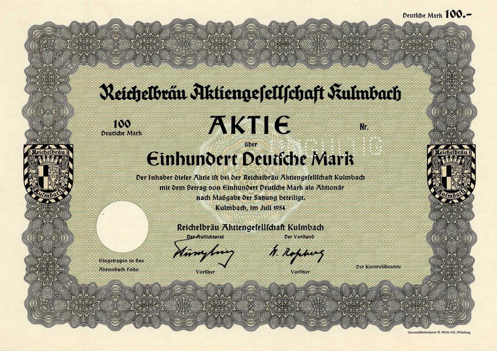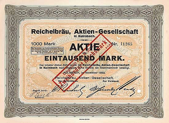 La fusione di Johann Wolfgang Reichel, Johann Konrad Scheiding e Johann Martin Huebner, i "lodanti cittadini", in una comunità della birra nel 1846 fu la vera nascita del Kulmacher Reichelbräu. Nel 1895 il birrificio di esportazione J. W. Reichel (Lichtenfelser Str. 7 nella parte occidentale della città) fu convertito in AG. Quotazione di borsa a quel tempo a Berlino, Monaco, Breslavia, Dresda / Lipsia. Nel 1930 acquisizione di tutte le azioni della Markgrafenbräu GmbH di Kulmbach, inoltre vengono acquisite le azioni dalla Kulmbacher Rizzibräu AG, che culmina in una fusione completa nel 1943. Furono rilevati anche il Löwenbrauerei Grafenwöhr (1976), il Sandlerbräu Kulmbach (1979), il Bürgerbräu Weiden (1982) e il Wernerbräu Neustadt / Cob. e il birrificio Sa... Altro