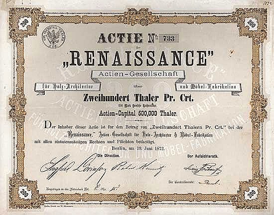Già esistente dal 1861, AG dal 1872. I membri fondatori includevano Siegfried Lövinson, Robert Kemnitz e il Dr. Julius Frühauf, le cui firme in facsimile sono sul pezzo. L'azienda è stata una delle prime AG di Berlino quotate in modo permanente nel settore industriale. Ha stabilito nuovi standard con i suoi prodotti, soprattutto in campo artistico. Inusuale lo statuto in materia di distribuzione degli utili: oltre alla consueta modalità di distribuzione per i membri del consiglio di sorveglianza e gli azionisti, il 10% degli utili è stato messo a disposizione di un "fondo di soccorso dei condannati liberati". I dividendi del 14% annunciati nel prospetto di sottoscrizione non sono stati raggiunti con la normale attività, motivo per cui la società ha tentato s... Altro