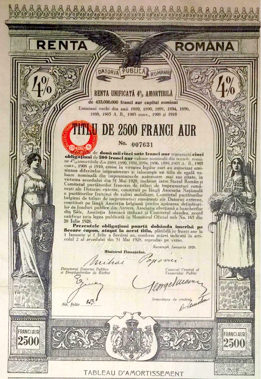 Renta Romana Gold Francs Public debt of Romania Unified Annuity 4% depreciable