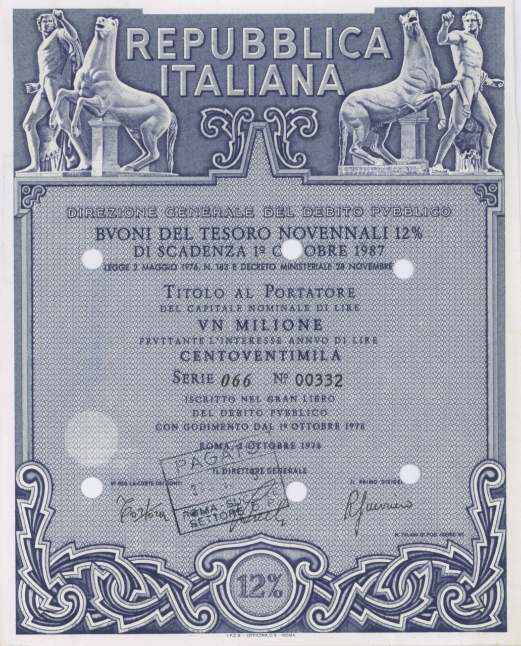 A-16324Repubbl. Ital. – BTP Nov. 12% – di Scad. 1° Ottobre 1987 al Port.-1Roma19781000000 di lireViolaR6 (51-100 pezzi)S4 (da 101 a 250 €)