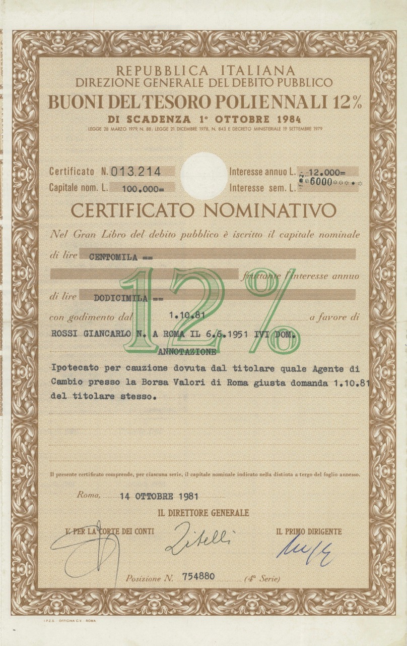Repubbl. Ital. – BTP Poliennali 12% – di Scad. 1° Ottobre 1984 Cert. Nomin.