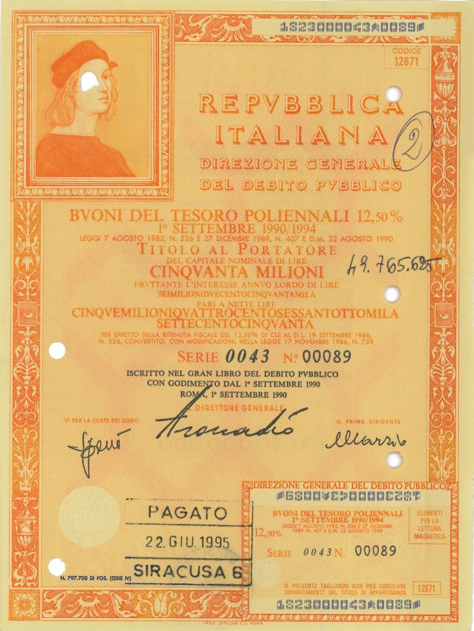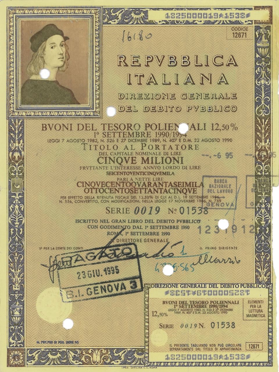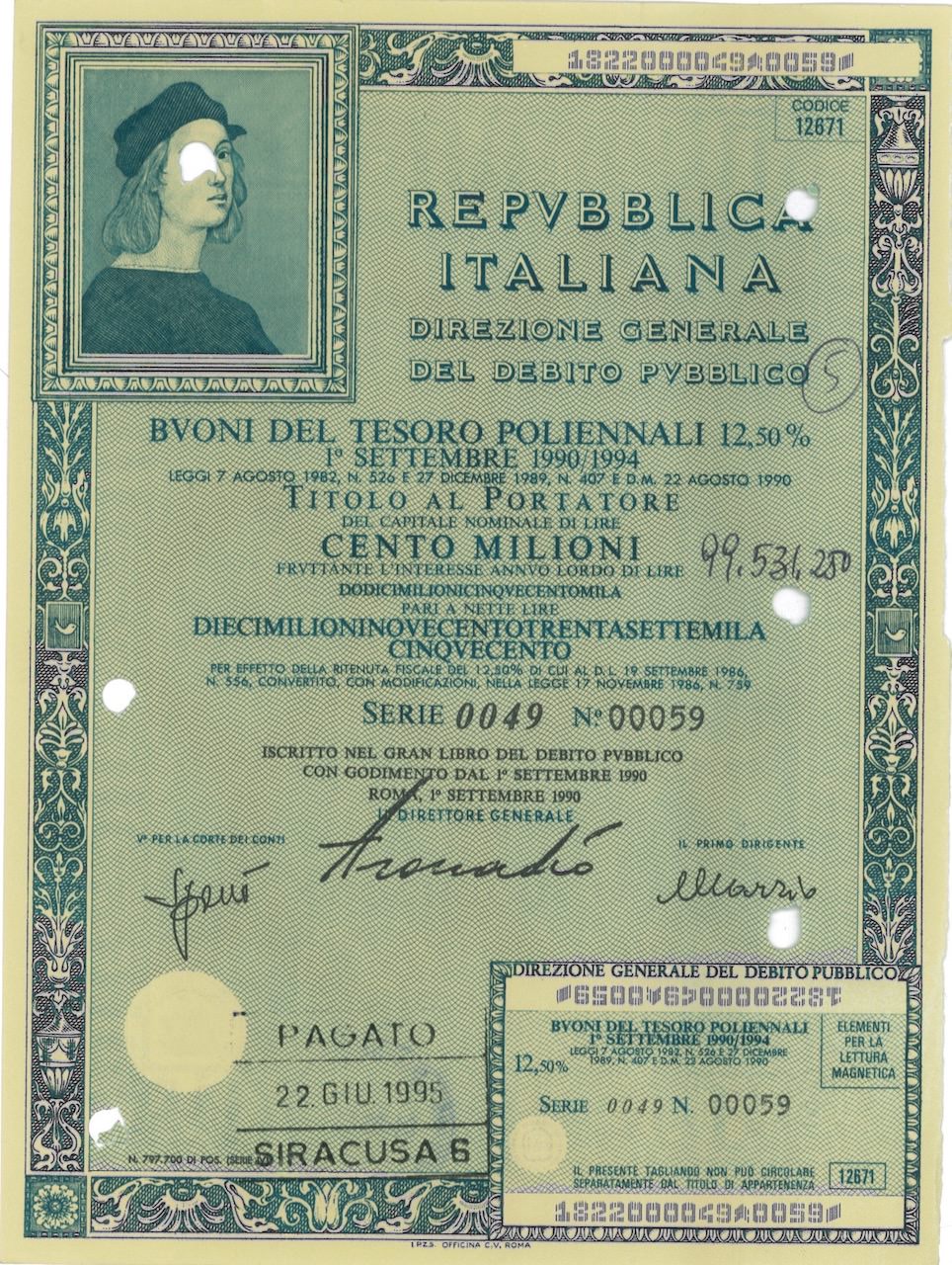 Repubbl. Ital. – BTP Poliennali 12,50% – 1° Settembre 1990/1994 al Port.