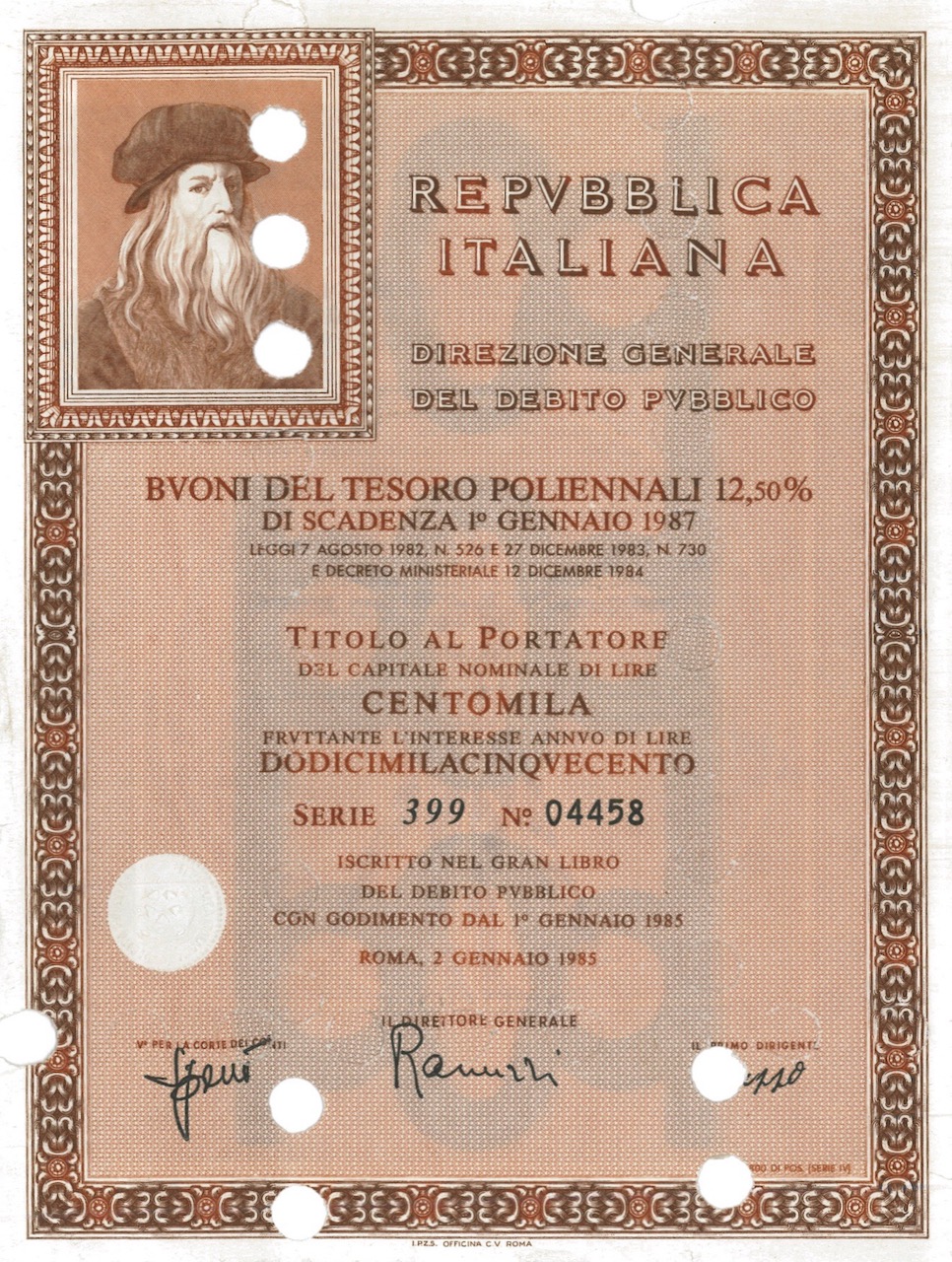 Repubbl. Ital. – BTP Poliennali 12,50% – di Scad. 1° Gennaio 1987 al Port.