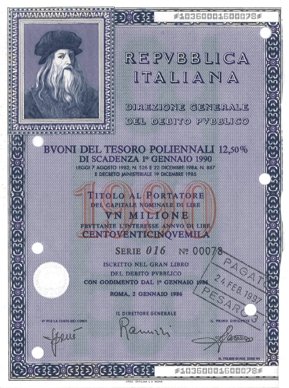 A-16451Repubbl. Ital. – BTP Poliennali 12,50% – di Scad. 1° Gennaio 1990 al Port.-1Roma19861000000 di lireViolaR3 (501-1000 pezzi)S2 (da 26 a 50 €)