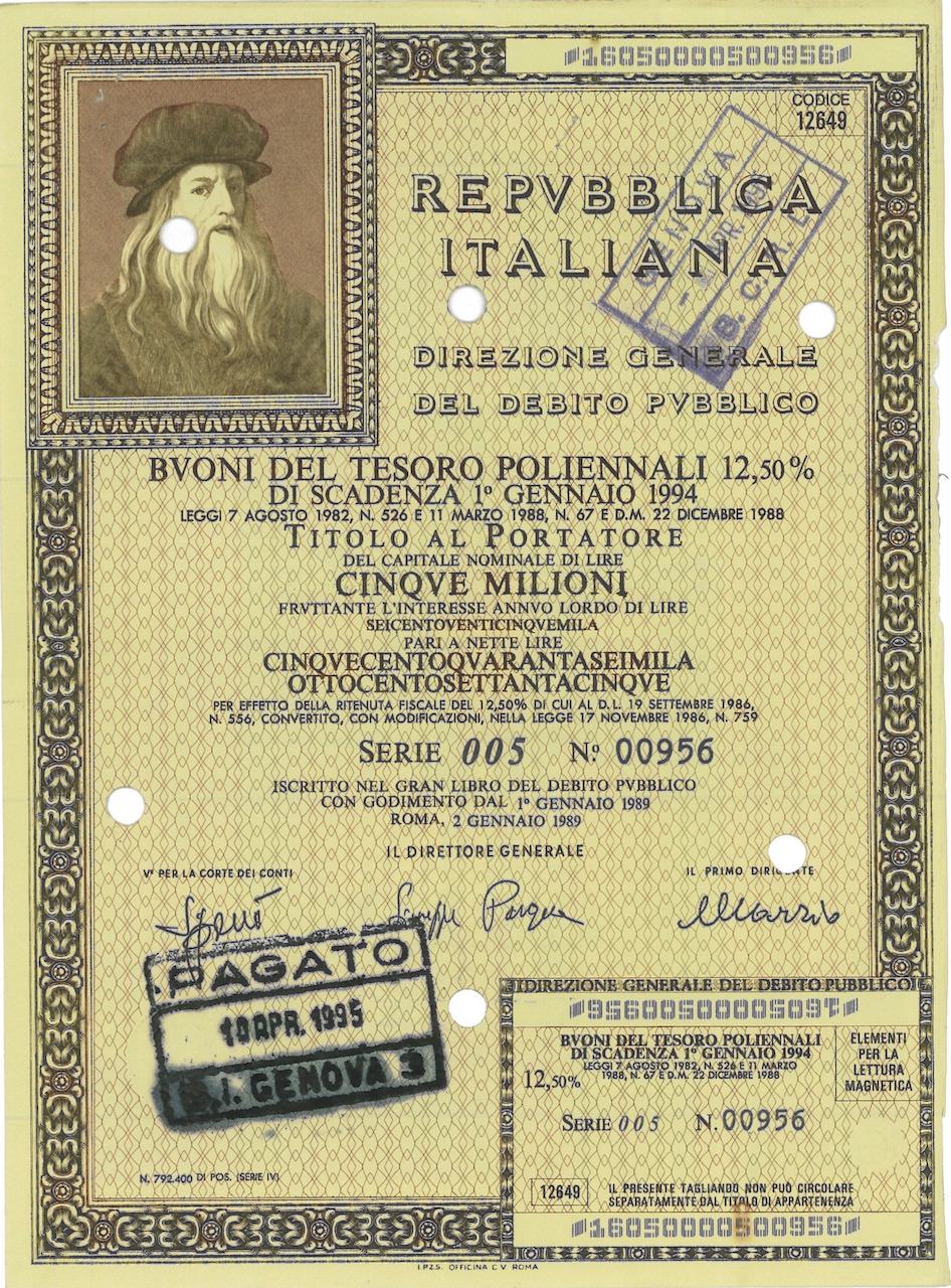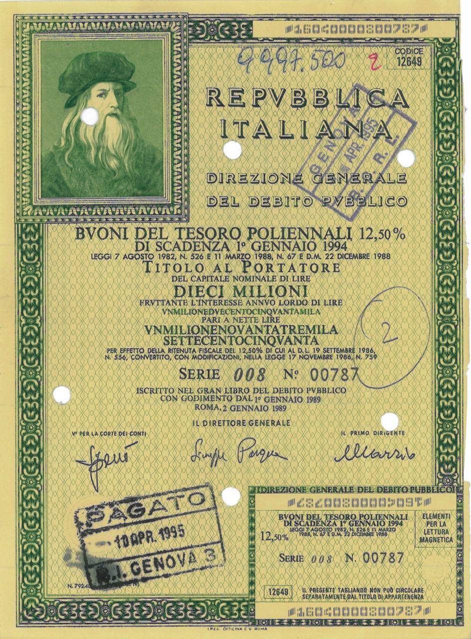 Repubbl. Ital. – BTP Poliennali 12,50% – di Scad. 1° Gennaio 1994 al Port.