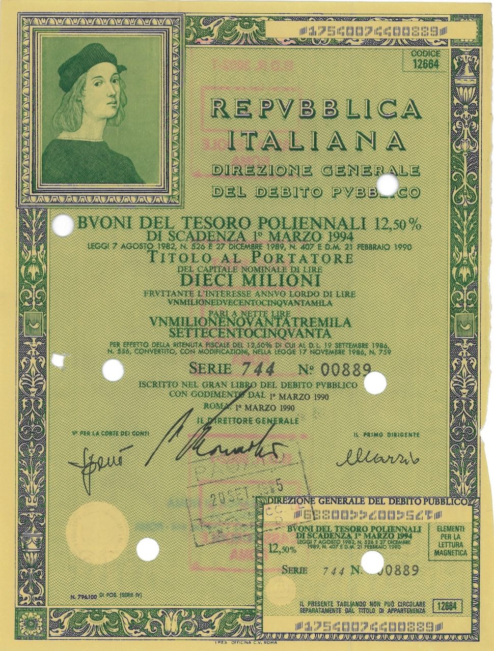 B-16587Repubbl. Ital. – BTP Poliennali 12,50% – di Scad. 1° Marzo 1994 al Port.-2Roma199010.000.000 di lireVerdeR3 (501-1000 pezzi)S2 (da 26 a 50 €)
