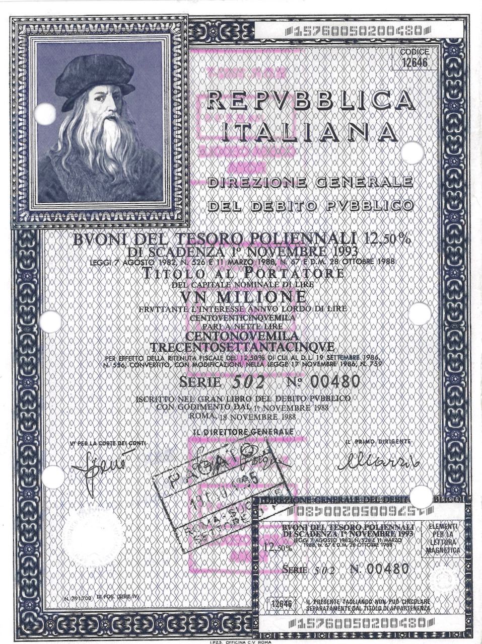 Repubbl. Ital. – BTP Poliennali 12,50% – di Scad. 1° Novembre 1993 al Port.