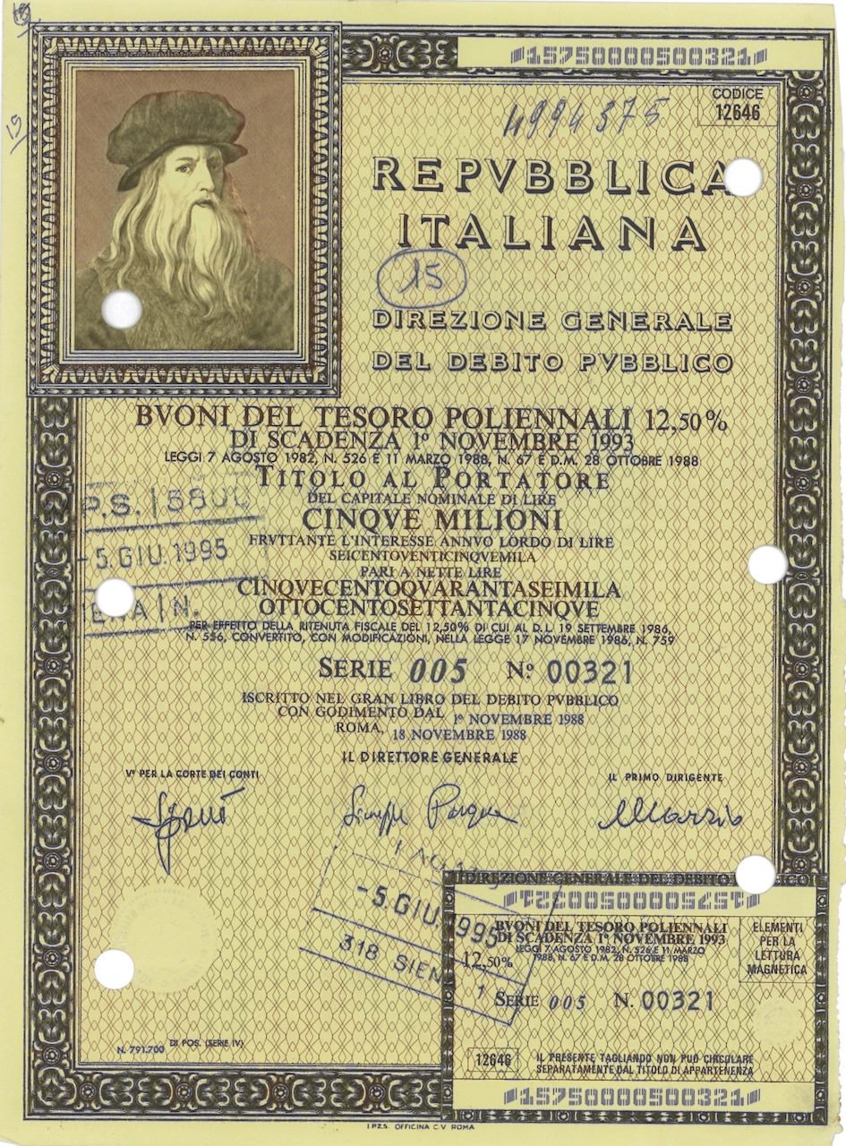 B-16544Repubbl. Ital. – BTP Poliennali 12,50% – di Scad. 1° Novembre 1993 al Port.-2Roma19885.000.000 di lireGialloR3 (501-1000 pezzi)S2 (da 26 a 50 €)