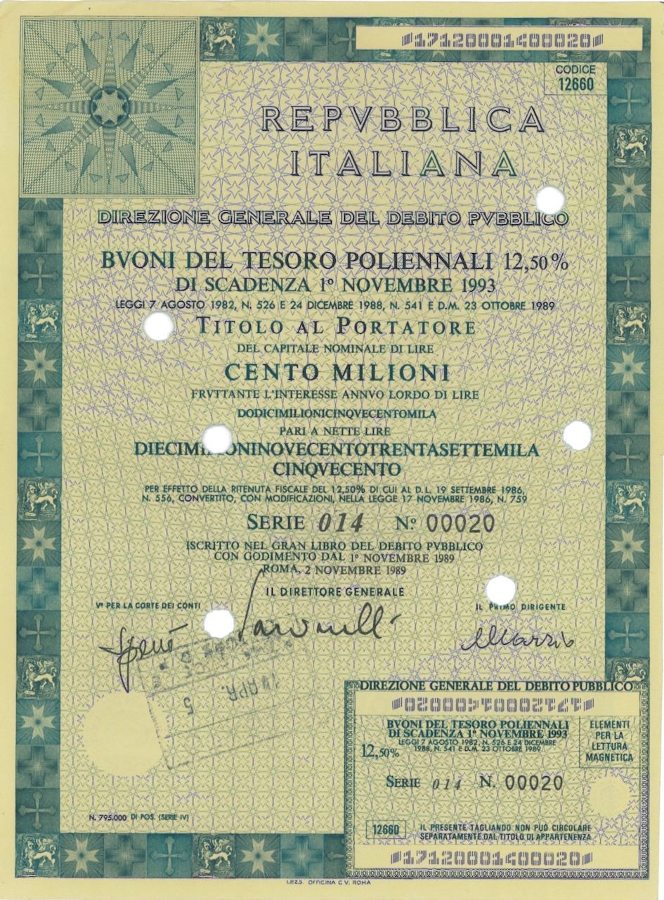 Repubbl. Ital. – BTP Poliennali 12,50% – di Scad. 1° Novembre 1993 al Port.