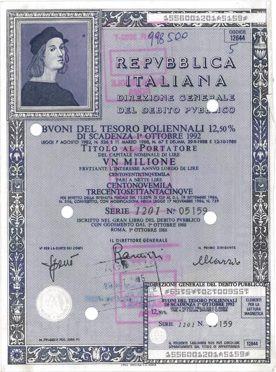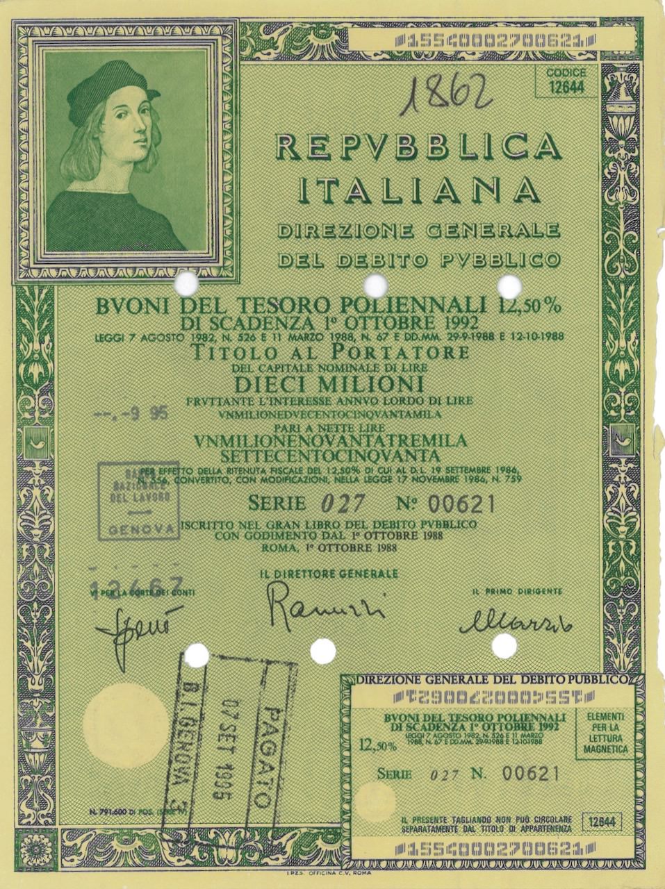 Repubbl. Ital. – BTP Poliennali 12,50% – di Scad. 1° Ottobre 1992 al Port.