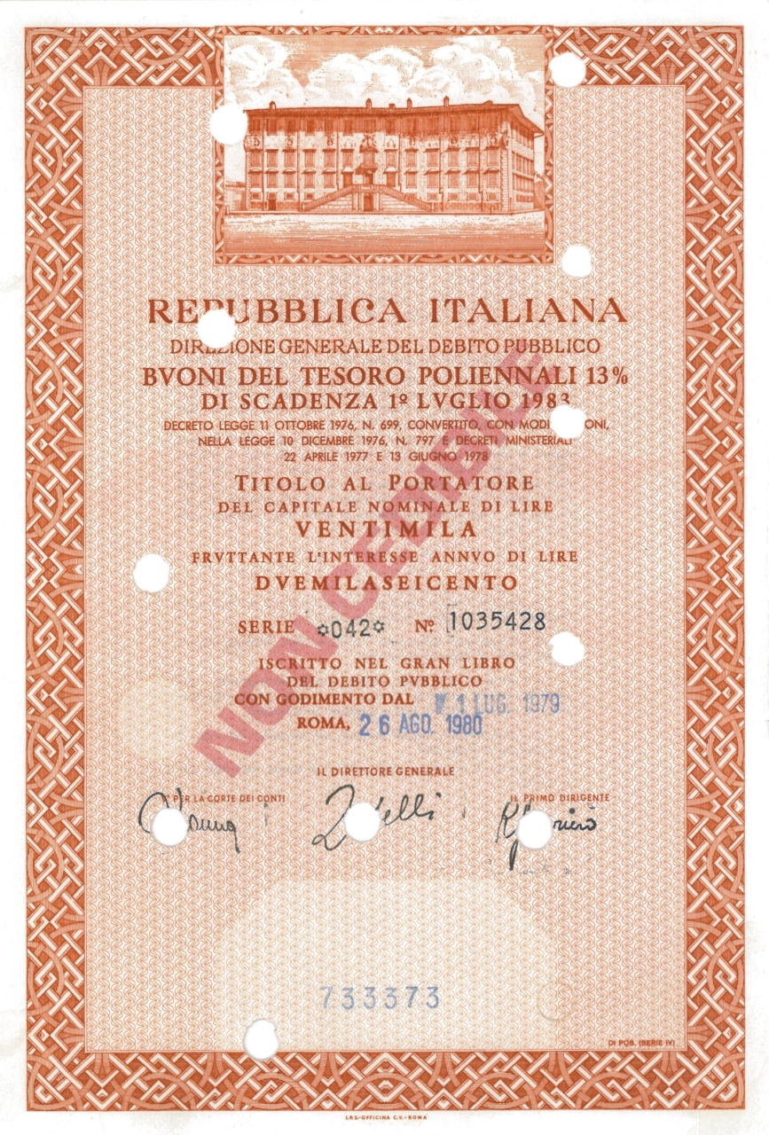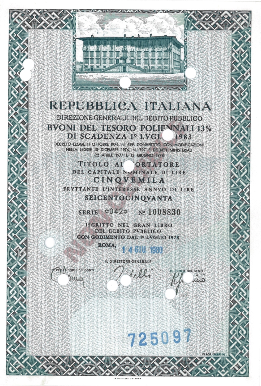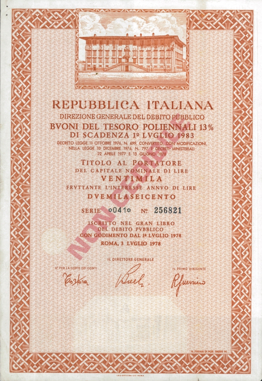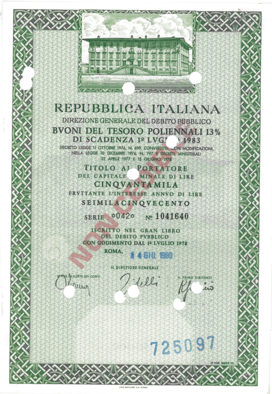 Repubbl. Ital. – BTP Poliennali 13% – di Scad. 1° Luglio 1983 al Port.