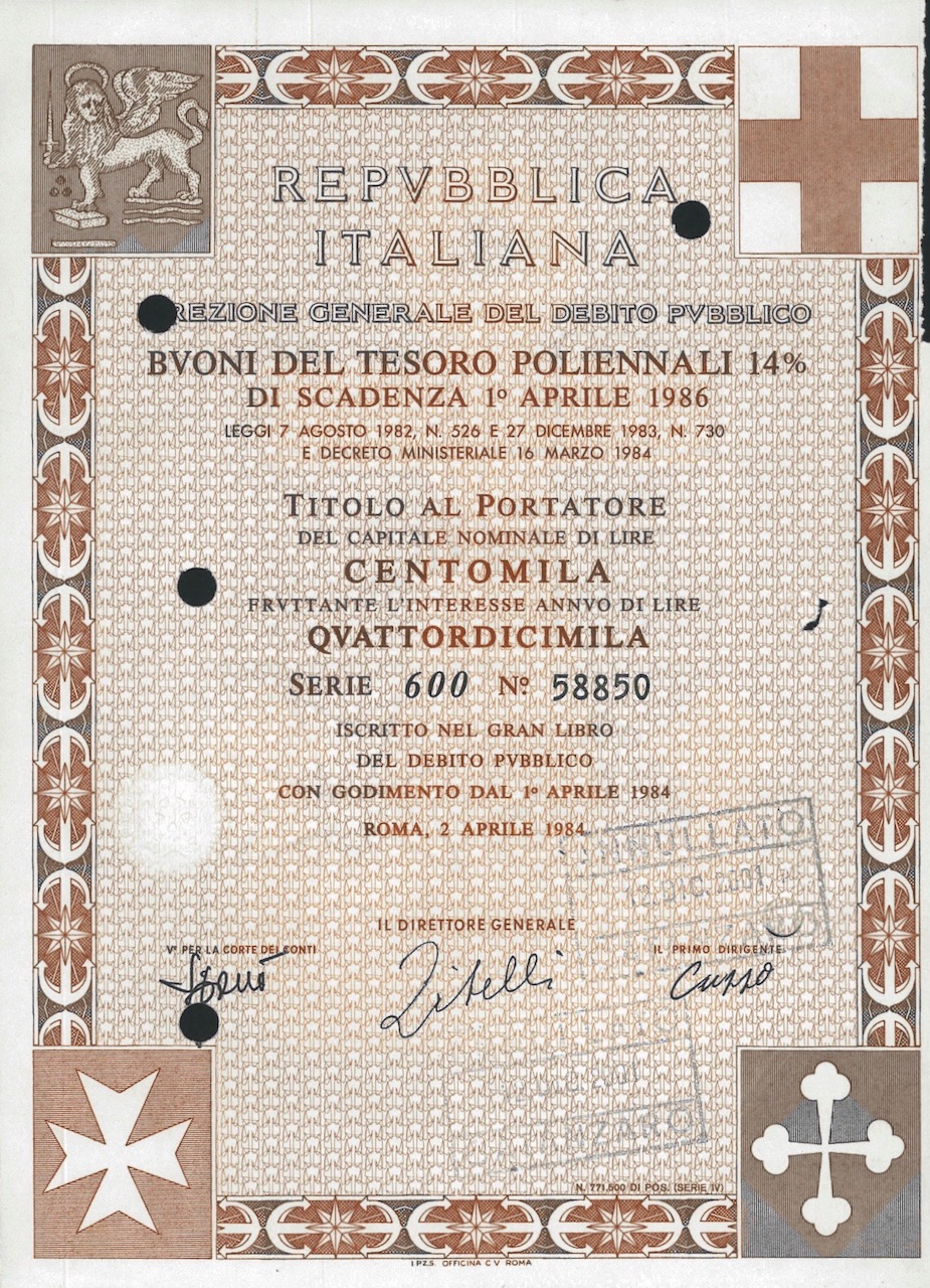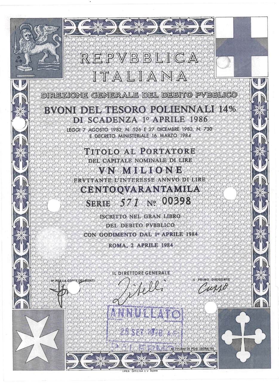 Repubbl. Ital. – BTP Poliennali 14% – di Scad. 1° Aprile 1986 al Port.