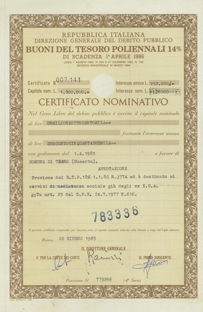 Repubbl. Ital. – BTP Poliennali 14% – di Scad. 1° Aprile 1986 Cert. Nomin.