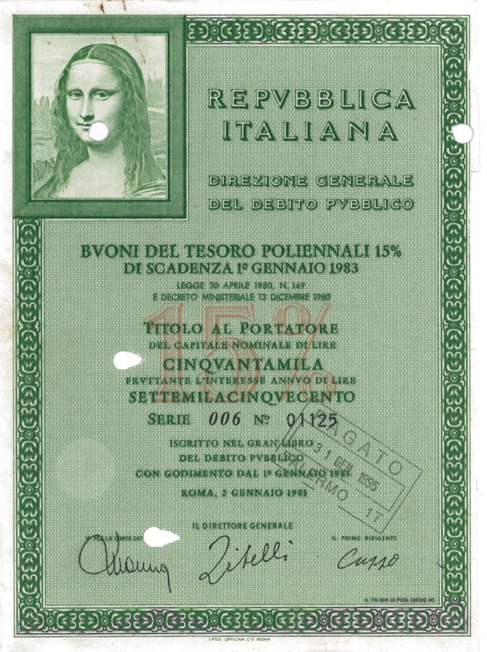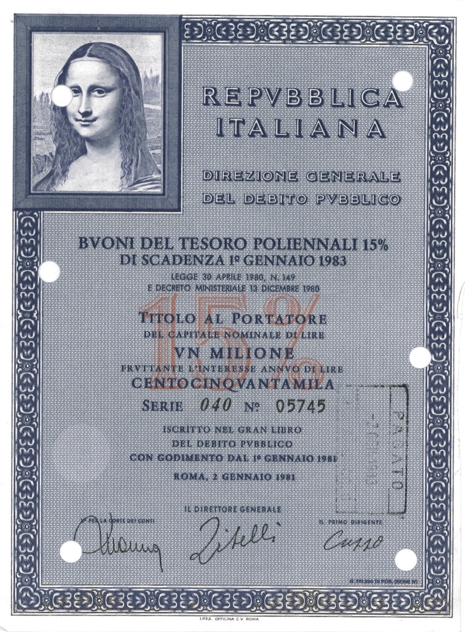 Repubbl. Ital. – BTP Poliennali 15% – di Scad. 1° Gennaio 1983 al Port.